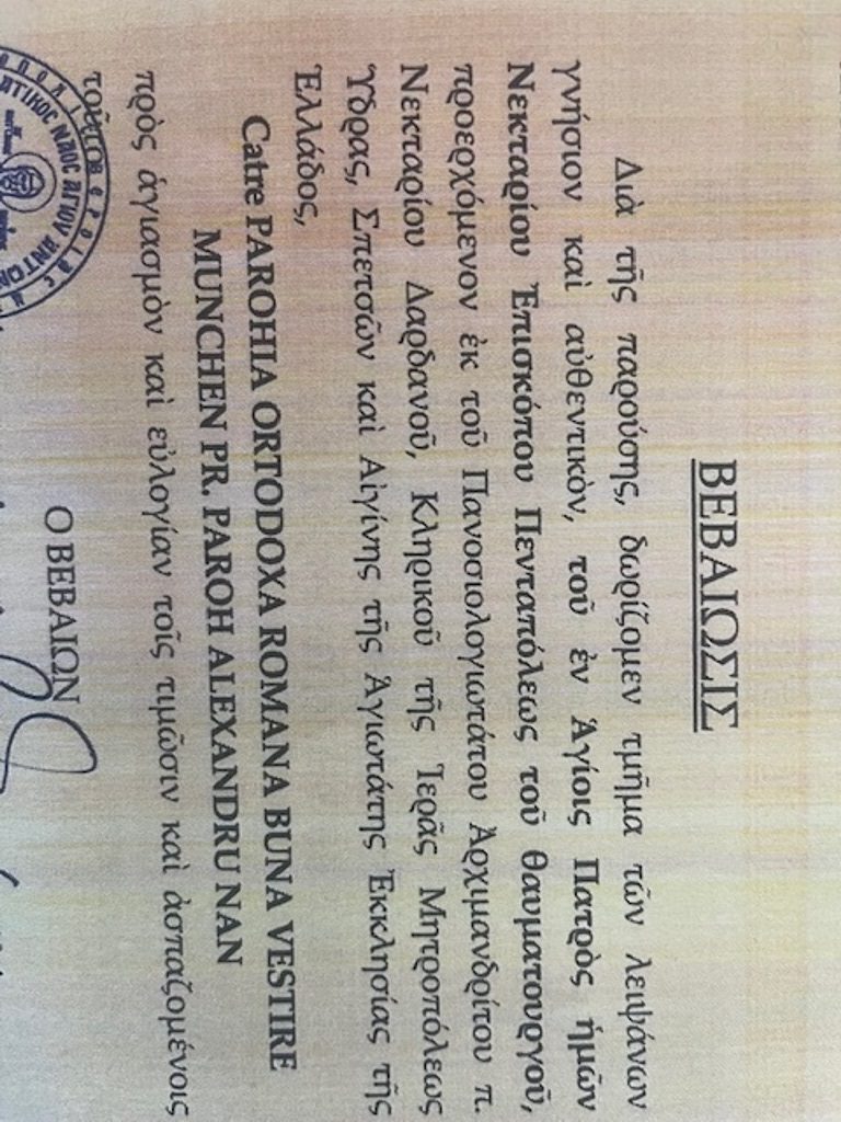 În contextul creșterii numărului de boli grave (nu doar cancer) în rîndul comunității münchene și bavareze, dobândirea unei părticele din moaștele Sf. Nectarie reprezintă un moment de mare bucurie și binecuvântare pentru membrii parohiei, dar, mai ales, pentru toți cei care au nevoie de puterea mijlocitoare a Sf. Ierarh Nectarie.