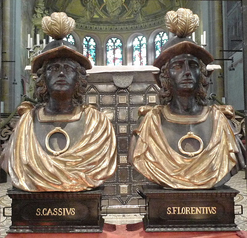 Trupurile sfinților au fost îngropate în taină de creștini, iar deasupra mormintelor s-au ridicat mai târziu biserici. Un act de donație atestă existența basilicii sfinților Cassius și Florentius în 649 d.Hr., deși ea se pare că datează din sec. IV. Sfintele lor moaște au fost ascunse pentru a nu fi profanate în timpul războiului de 30 de ani și abia în 1928-1929, în urma unor lucrări de restaurare a domului din Bonn, ele au fost redescoperite într-unul dintre turnurile laterale, fiind așezate în 1971 într-un nou relicvar.