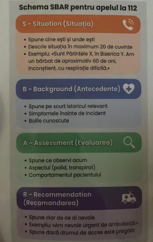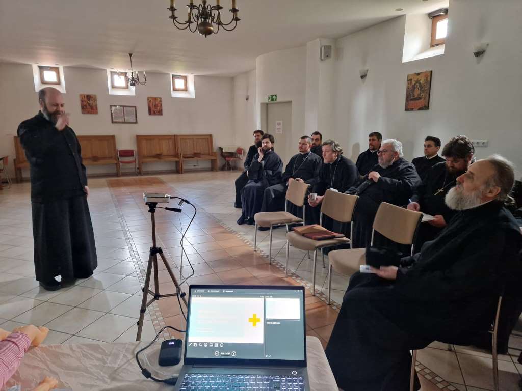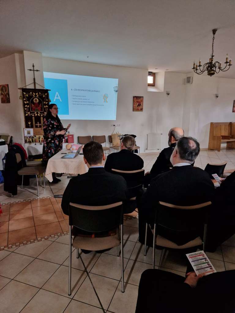 Seminarul a fost organizat pe trei secțiuni, prima axându-se îndeosebi pe schema standard de evaluare și reevaluare „ABCDE”, care este folosită în astfel de situații, fiind preluată din practica echipelor de intervenție medicală, pe schema „SBAR”, ce se preocupă îndeosebi de comunicarea cât mai exactă și rapidă a situației către personalul de prim-ajutor (serviciul de ambulanță), precum și pe tehnicile prim-ajutor pe care le poate aplica cineva unei persoane aflate în dificultate (stare de leșin sau de inconștiență, sângerări sau chiar epilepsie). Ca o situație specială, li s-a explicat preoților că o situație primejdioasă nu poate să apară la botezul copiilor decât atunci când aceștia sunt bolnavi sau sunt hrăniți imediat înainte de scufundarea în apa din cristelniță, și că fiecare bebeluș păstrează până cel puțin în luna a șaptea după naștere, dar și, parțial, până după vârsta de un an, un reflex inconștient de închidere a căilor respiratorii în momentul contactului cu apa, în așa fel încât Botezul pruncilor este cât se poate de sigur.