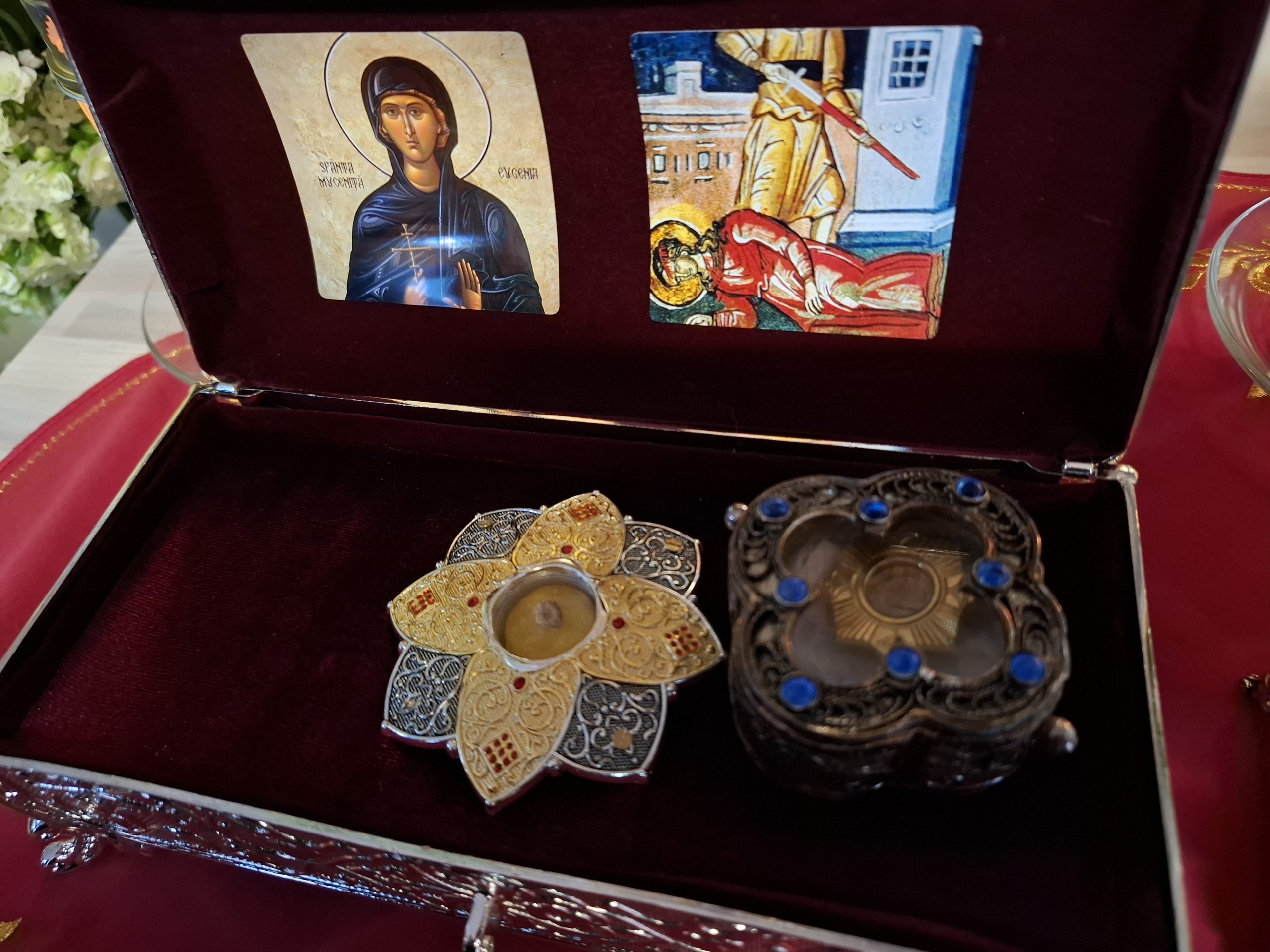 Cu câteva zile înainte de sărbătoarea Acoperământului Maicii Domnului, comunitatea de români ortodocși din Gotha, landul Thüringen – Germania, și-a serbat hramul. Cu acest prilej, în data de 27 septembrie a.c., Înaltpreasfințitului Părinte Serafim, Mitropolitul Germaniei, Europei Centrale şi de Nord, însoțit de părintele diacon Dumitru Dura, doctorii Rudolf şi Claudia Maternik precum şi de toată familia părintelui Bogdan Florin Buta, s-au întâlnit în cripta Domului din Erfurt cu episcopul auxiliar Dr. Reinhard Hauke, pentru a primi în dar, o părticică din moaştele Sfintei Cuvioase Mucenițe Eugenia şi un fragment din moaștele sfintelor fecioare, martirizate împreună cu Sfânta Ursula (aceasta din urmă, împreună cu cele 11.000 de aparţinătoare, a primit moartea mucenicească la vârsta de 11 ani, în jurul anului 386, în Köln-Germania). După înmânarea sfintelor moaște, Ierarhul şi cei care l-au însoțit, au vizitat Domul şi au cântat troparul sfinţilor mucenici la racla ce adăposteşte peste zeci de moaşte din primele secole ( Sf. Ap. şi Evanghelist Matei, Sf. Mercurie, Sf. Mc. doctori fără de arginţi, Cosma şi Damian, e.t.c).