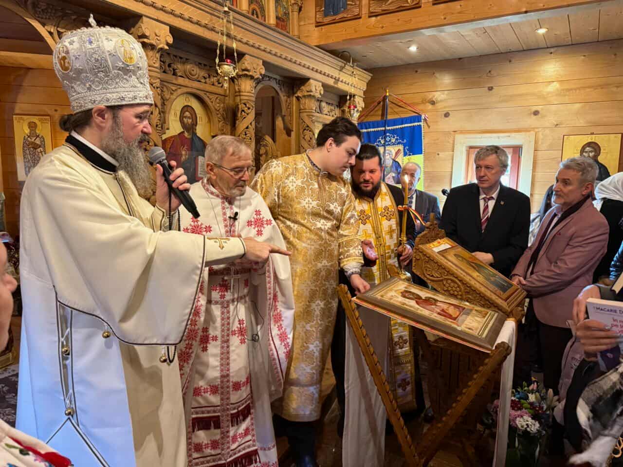 Preotul Dumitru a mulțumit Ierarhului pentru slujire și a subliniat bucuria și onoarea de a fi vizitați din nou la Salzburg, după 17 ani, când în anul 2009, Preasfințitul Episcop Macarie a făcut parte din soborul arhieresc, care a sfințit biserica de lemn românească. A mulțumit respectuos pentru Darul sfințit, icoana Maicii Domnului „Alăptătoarea”, dar și pentru conferirea sfintei distincții „Crucea Nordului”, decizie arhierească ce onorează profund, dar și responsabilizează pe preot și credincioși să slujească cu mai multă râvnă în Ogorul Bunului Dumnezeu.