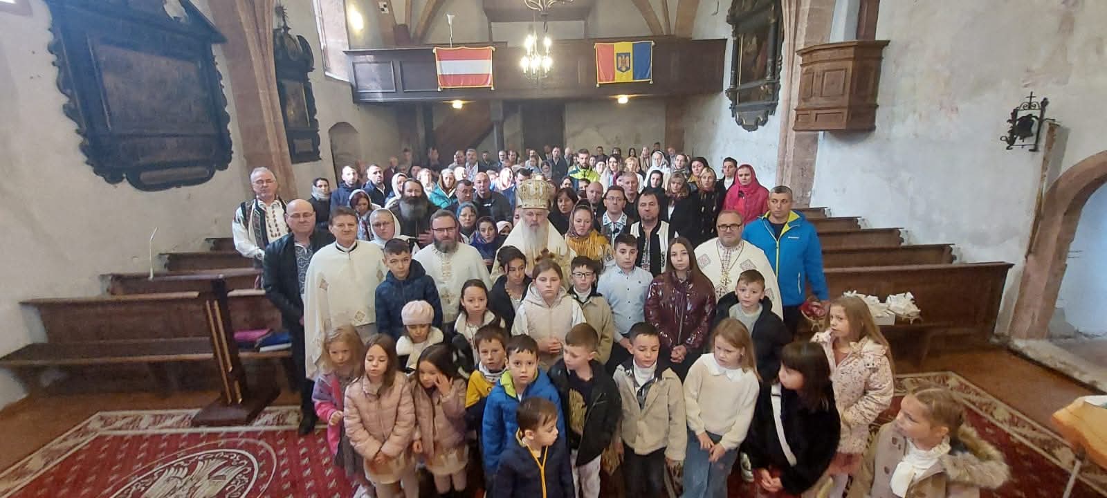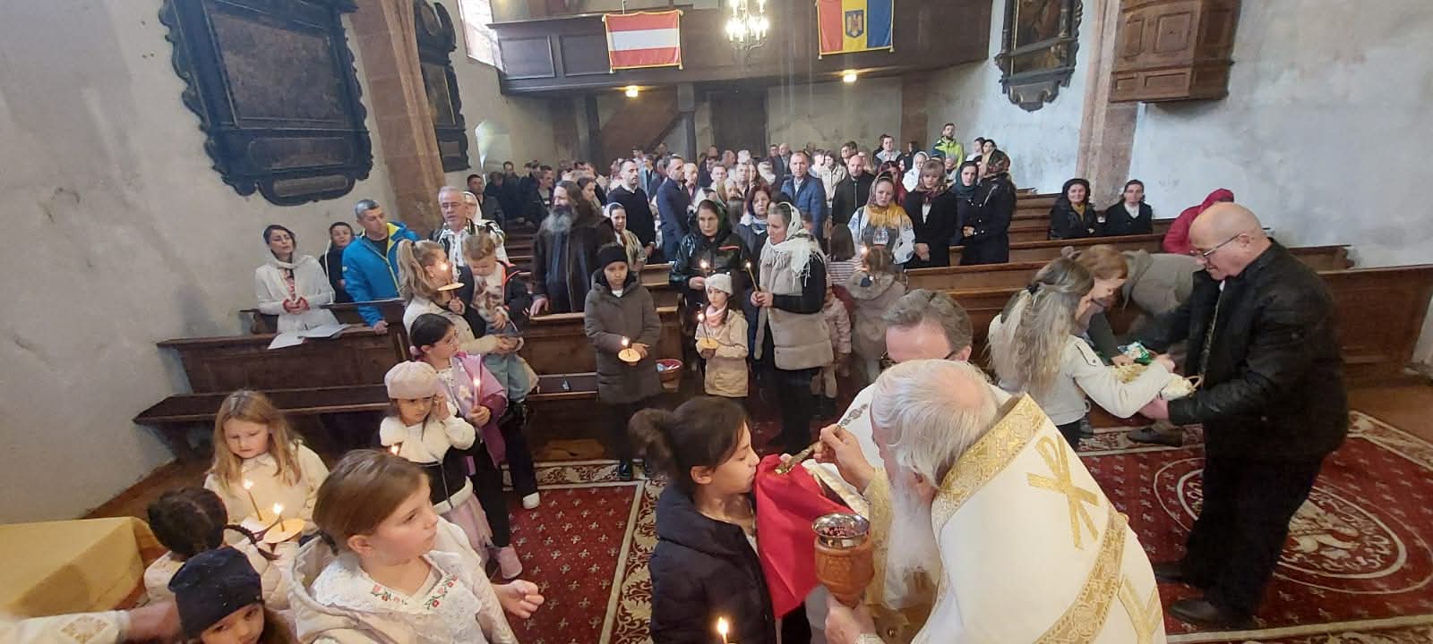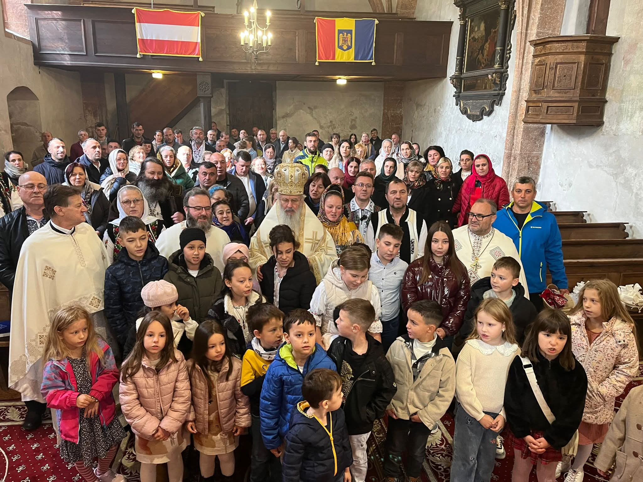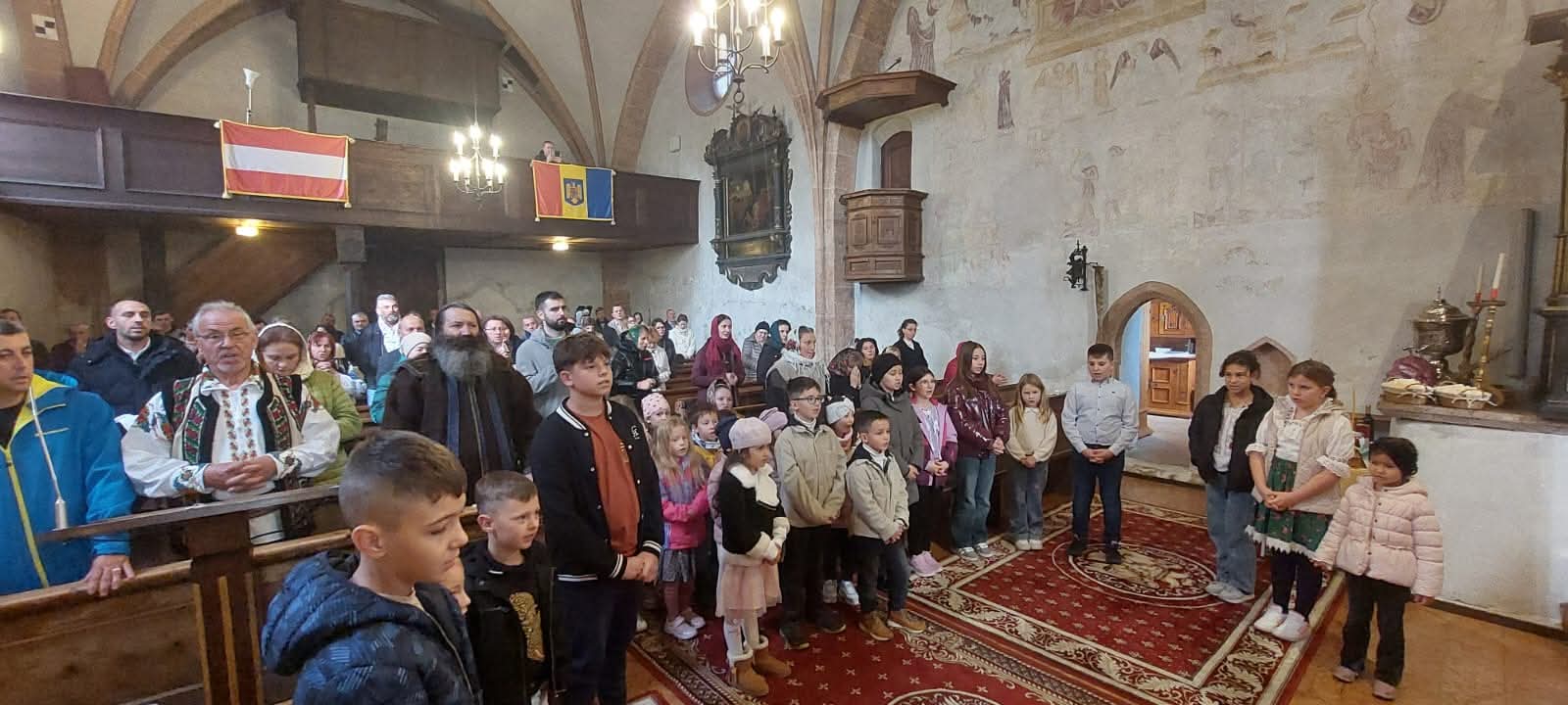 Sărbătoarea a început cu hrana duhovnicească, și anume, participarea la Sfânta Liturghie arhierească, săvârșită în profundă liniște și rugăciune, între zidurile vechi de peste 1000 de ani, ale bisericii Frauenkirche, la poalele munților Alpi din Bischofshofen. Rugăciunea, bucuria comuniunii, împărtășirea cu Sfintele Taine, cuvântul blând și plin de înțelepciune al mitropolitului nostru, vocile calde ale copiilor veniți în număr mare, dragostea tuturor credincioșilor, dar și portul tradițional al iei și al costumului popular, au îmbrăcat biserica cu duhul ortodoxiei autentice, transformând-o într-o mică Românie, în biserica de acasă.