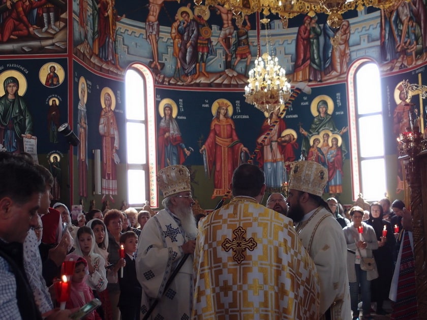 La Sărbătoarea parohiei, încă de dimineaţa au fost de față numeroși credincioși din Oraș și oaspeți din diferite parohii, care s-au bucurat să asiste la săvârşirea slujbei târnosirii (sfinţirii) altarului şi a întregii bisericii de către Înaltpreasfinţitul Părinte Mitropolit Serafim, împreună cu PS Părinte Sofian Braşoveanul, Episcop-vicar al Arhiepiscopiei Germaniei, Austriei şi Luxemburgului şi PS Atanasie de Bogdania, Episcop-vicar al Episcopiei Italiei. Slujba de sfinţire a început cu înconjurarea bisericii, care a fost unsă cu Sf. Și Marele Mir în dreptul celor trei abside, iar apoi cei trei ierarhi au aşezat în piciorul Sfintei Mese, potrivit rânduielii, Sfinte Moaşte, un hrisov amintind de ziua sfinţirii şi participanţii la acest eveniment, iar apoi au pecetluit altarul, după ce au aşezat pe Sfânta Masă icoanele celor patru Sfinţi Evanghelişti. Slujba a a continuat cu ungerea cu Sfântul şi Marele Mir şi stropirea cu apă sfinţită a catapetesmei și a frescelor din biserică.