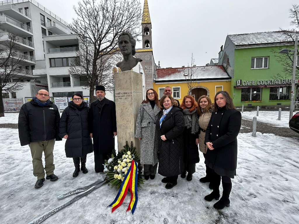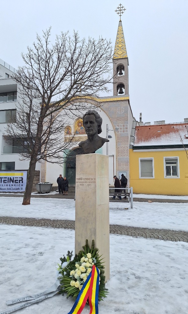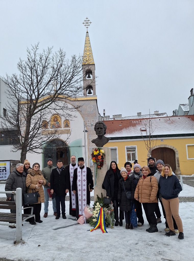 Cu acest prilej, ca şi în anii trecuţi, această sărbătoare a fost marcată la Viena prin două evenimente comemorative și omagiale. La statuia poetului naționa Mihai Eminescu, aşezată în faţa bisericii Parohiei „Sf. Ap. Andrei” din Viena, PC Pr. Dr. Nicolae Dura, Vicar pentru Austria împreună cu PC Pr. Mircea Morar, alături de un grup de credincioși, au săvârșit slujba de pomenire la împlinirea celor 176 de ani de la naşterea poetului. Momentul solemn s-a încheiat prin depunerea de flori din partea Ambasadelor României şi Moldovei, a Institutului Cultural Român din Viena şi a Asociaţiilor „Mihai Eminescu” şi „Unirea” din Viena.